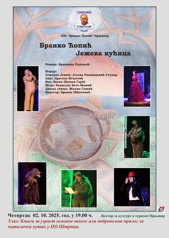 „Јежева кућица“ у извођењу радника наше школеГрупа радника ОШ „Бранко Ћопић“ Прњавор опробала се и на позоришним даскама кроз припрему представе „Јежева кућица“ по познатом дјелу Бранка Ћопића, писца по којем наша школа носи назив. Жеља нам је да промовишемо читалаштво, али и да прикупимо књиге и средства за формирање читалачког кутка у нашој подручној школи у Штрпцима.Добро нам дошли!